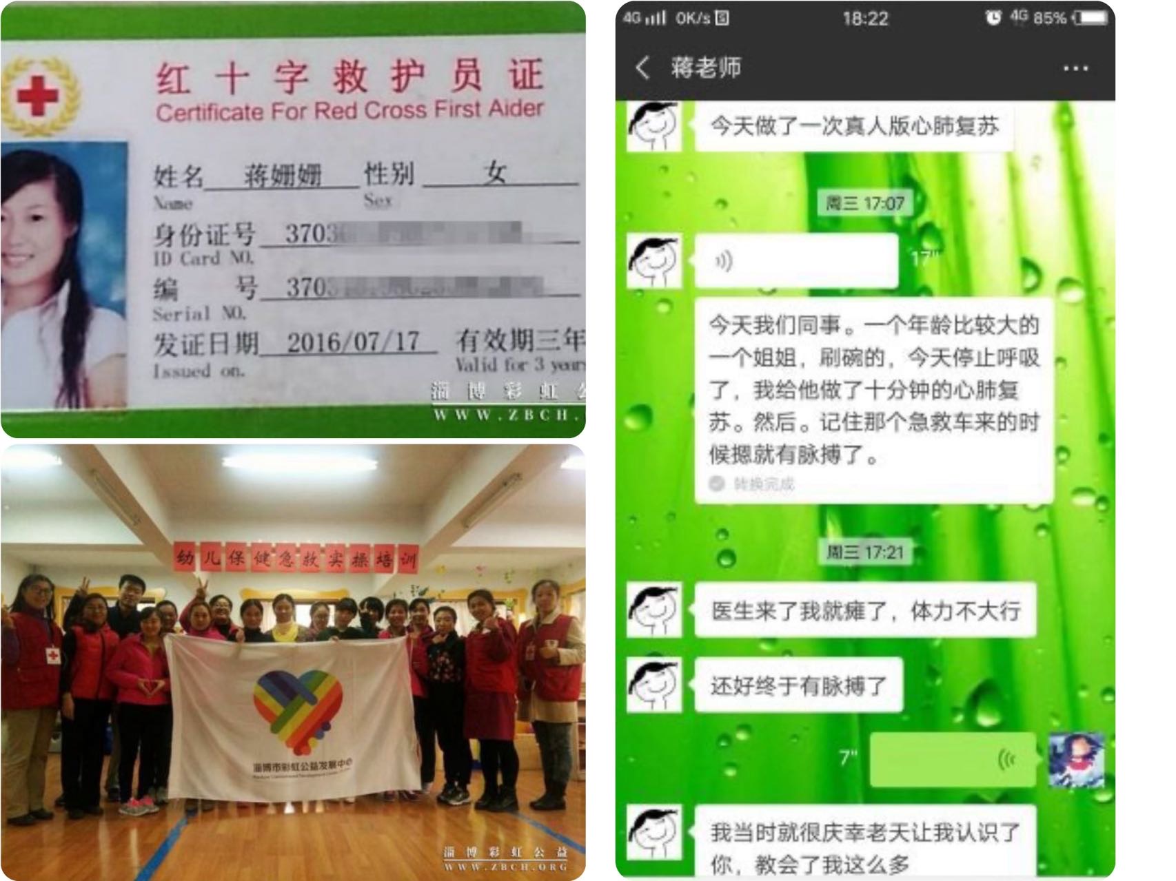 蒋姗姗老师是淄博彩虹公益“为生命续航”志愿者技能培训项目第七期的学员。2018年9月19日中午,她正在给小班老师进行蒙氏培训,突然一名同事跑来呼喊:“姗姗,快过去看看!王姐晕倒了!”蒋姗姗立刻放下手中的教具冲向事发地点,边跑边催促同事拨打120。当她到达食堂时,发现王姐正躺在同事身上。她迅速检查了王姐的身体状况——没有呼吸,没有任何生命迹象。