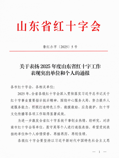 近日,山东省红十字会发布《关于表扬2025年度山东省红十字工作表现突出单位和个人的通报》(鲁红办字〔2025〕5号),对全省红十字系统中表现优异的单位和个人予以表彰。
